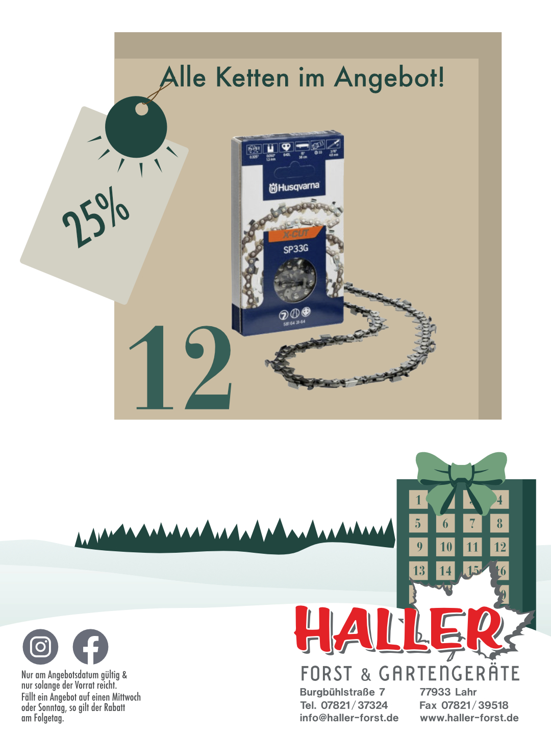 mehr lesen ...Alle Ketten im Angebot. Perfekt für den Winterdienst und deine Sägearbeit. Heute 25 Prozent Rabatt bei Haller